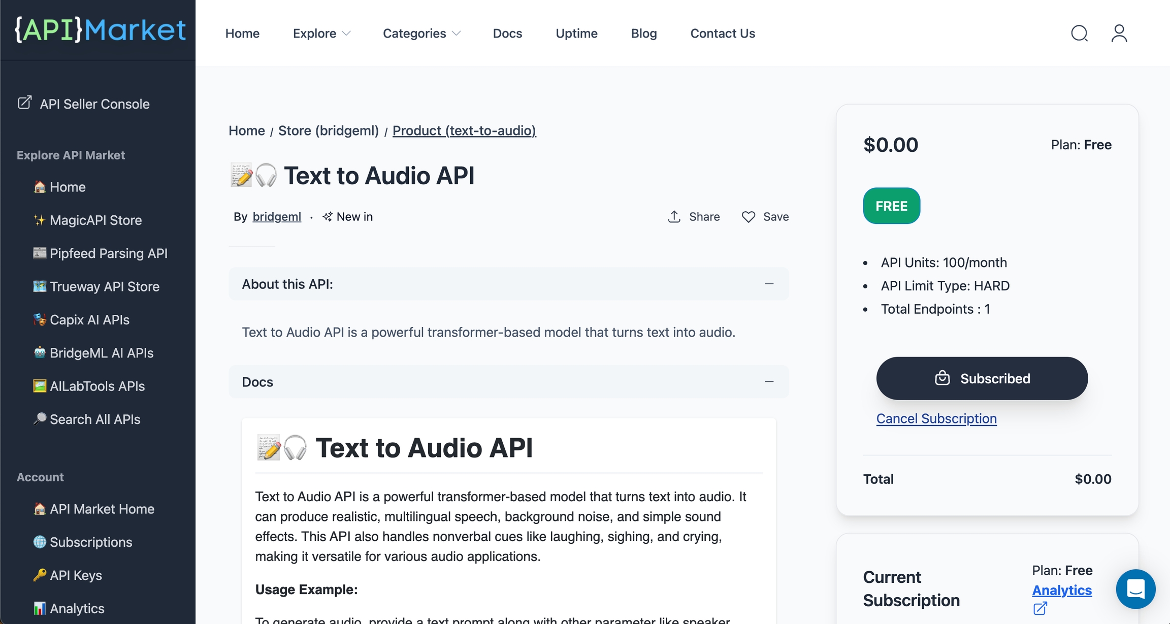 Developer Portal : https://api.market/store/bridgeml/text-to-audio